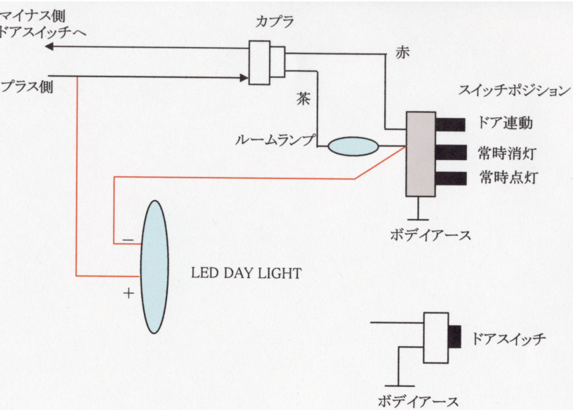 どうするかというと、ルームランプを外して、スイッチにもう一本電線を半田付けしてLED DAY LIGHTのマイナス側につなぎ、プラス側はルームライトのプラス側とつなぎます。
